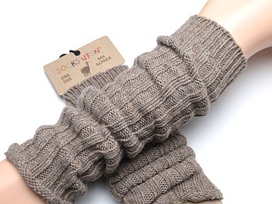 Partially woolen legwarmers with rib pattern in light beige and ivory. The elastic at the top keeps them in place while the bottom is loose.