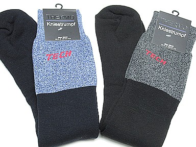 Set of thick cushioned thermo kneehighs in navy (with denim cuff) and black (with grey cuff). Apart from the cuff with the text 'tech' they are plain colored.