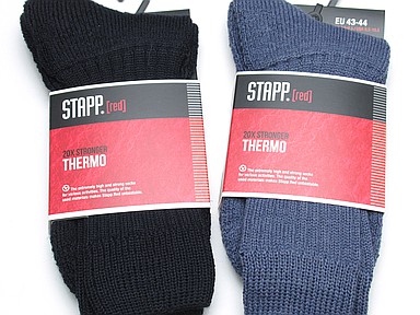Thermal work socks from Stapp with a flat toe seam and a little bit of merino wool. They have a reinforced heel and toe for extra strength.